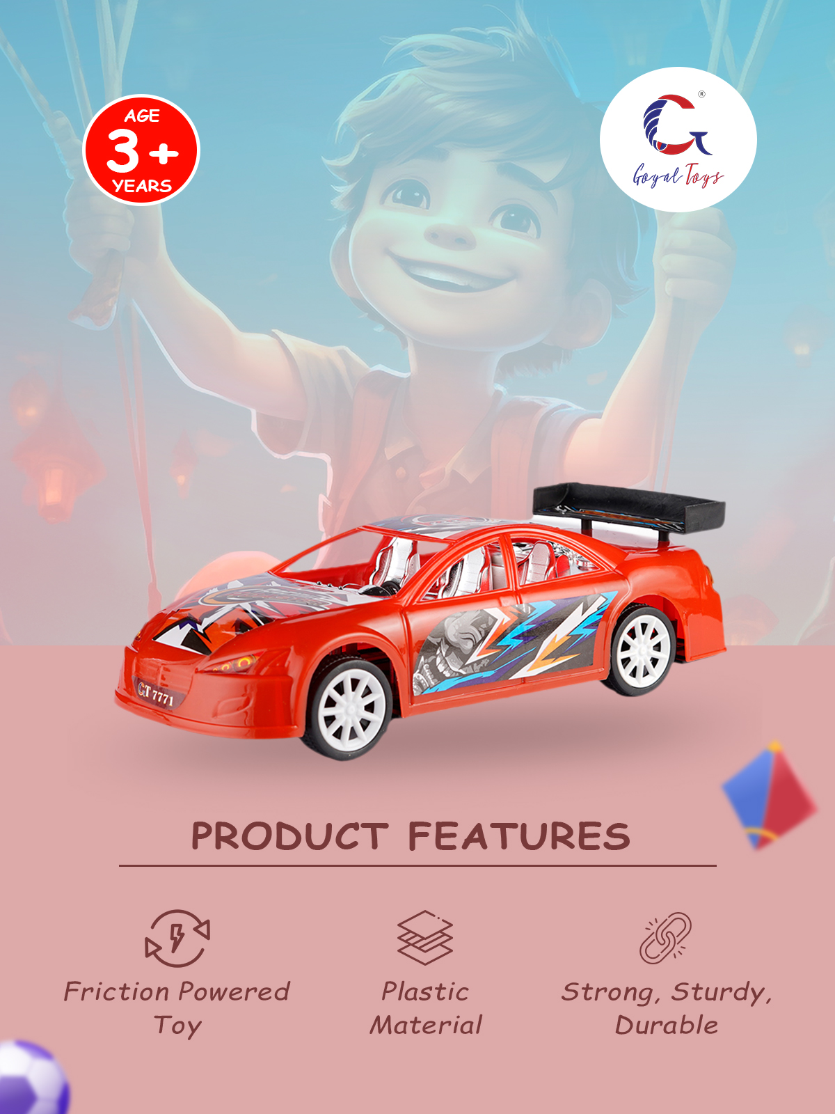 - Quality : The Goyal Toys is constructed of non-toxic plastic material. It is absolutely safe for children. The friction-powered toy is typically sturdy and durable, ensuring they can withstand the rough play and handling of young children. They are commonly made from materials like plastic , providing longevity and resistance to wear and tear.