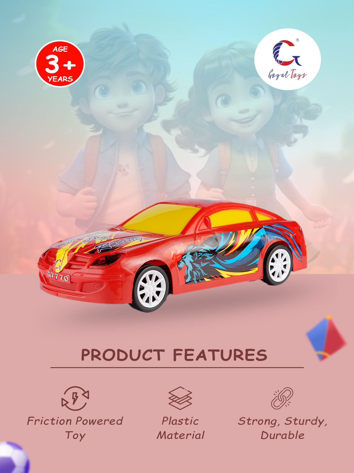 - Quality : The Goyal Toys is constructed of non-toxic plastic material. It is absolutely safe for children. The friction-powered toy is typically sturdy and durable, ensuring they can withstand the rough play and handling of young children. They are commonly made from materials like plastic , providing longevity and resistance to wear and tear.